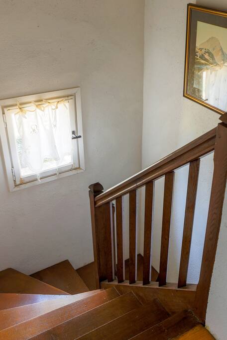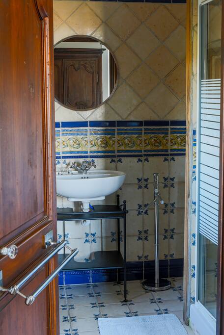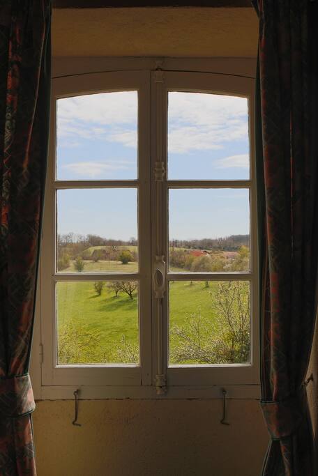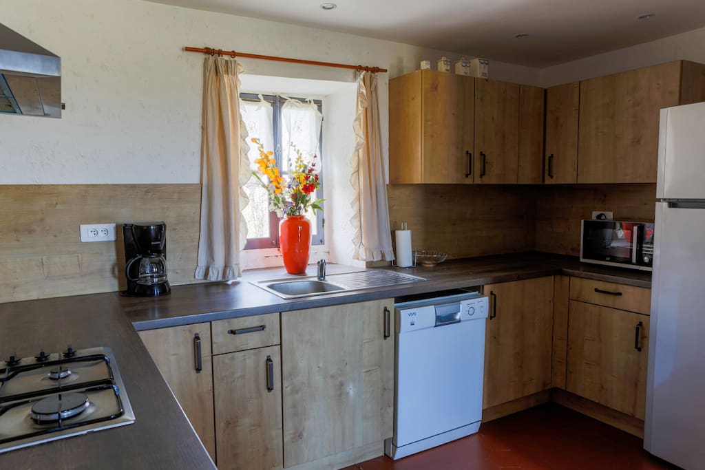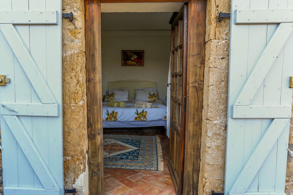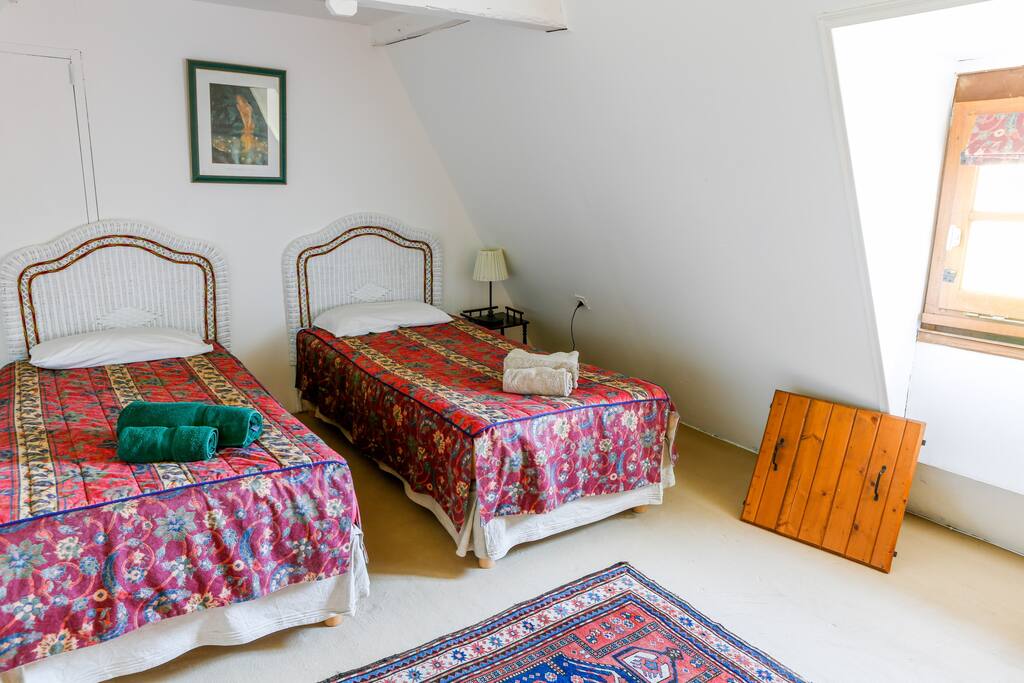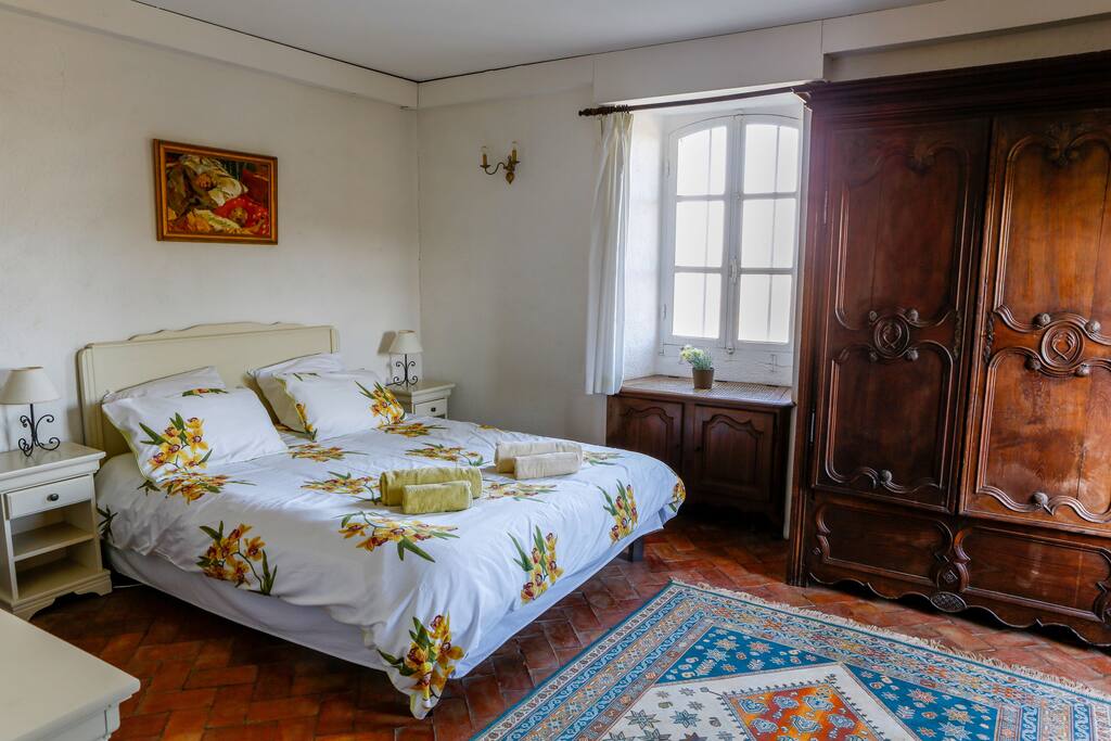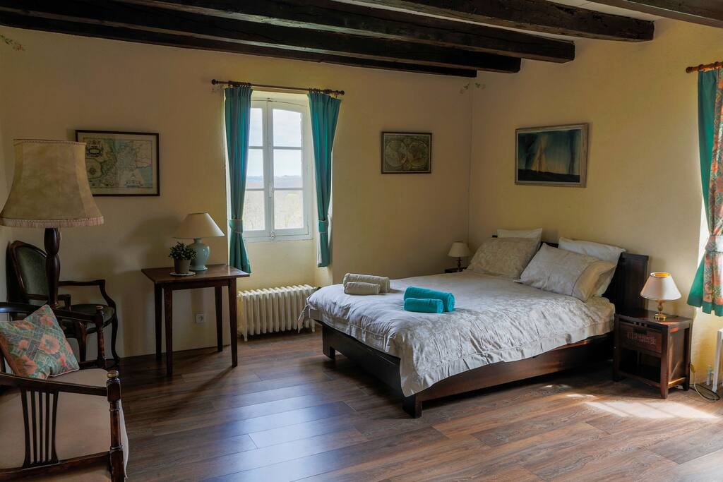 On the ground floor is a double en-suite bedroom and a laundry room with stairs to the first floor and the master bedroom, a bathroom and the salon/dining room with fully-equipped kitchen. The salon has a television, DVD player and comfortable sofas and chairs, as well as a small dining table, and enjoys separate access to the stone terrace, with views of the surrounding countryside and the Château. A wooden staircase leads from the salon to a twin bedroom on the second floor. An additional building, La Fermette contains a bedroom with a double and a single bed, and a toilet/shower room allowing 3 additional guests. La Fermette can be booked at AirBnB at the same map location as La Ferme.